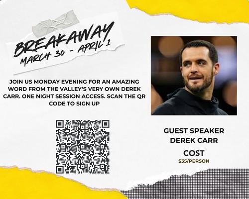 Join us Monday March 30 at 7pm for a special Breakaway Conference session with Derek Carr as he shares the word and his testimony.